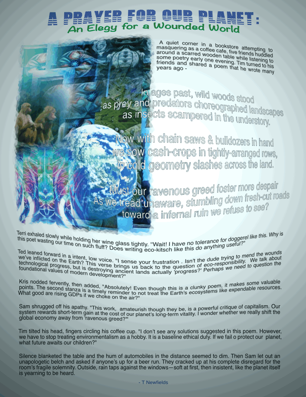 Tim tilted his head, fingers circling his coffee cup. "I don’t see any solutions suggested in this poem. However, we have to stop treating environmentalism as a hobby. It is a baseline ethical duty. If we fail o protect our planet, what future awaits our children?"