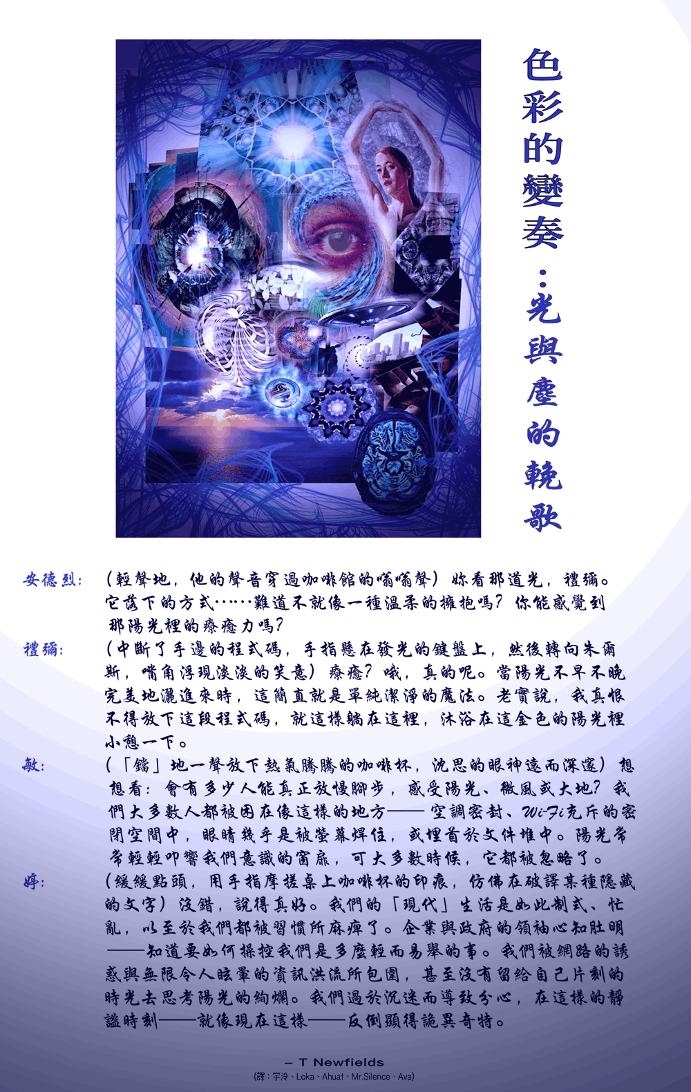 (緩緩點頭,用手指摩搓桌上咖啡杯的印痕,仿佛在破譯某種隱藏的文字)沒錯,說得真好。我們的「現代」生活是如此制式、忙亂,以至於我們都被習慣所麻痺了。企業與政府的領袖心知肚明——知道要如何操控我們是多麼輕而易舉的事。我們被網路的誘惑與無限令人眩暈的資訊洪流所包圍,甚至沒有留給自己片刻的時光去。 |