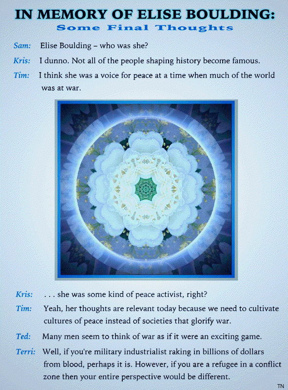 | Tim: | Yeah, her thoughts are relevant today because we need to cultivate cultures of peace instead of societies that glorify war. |