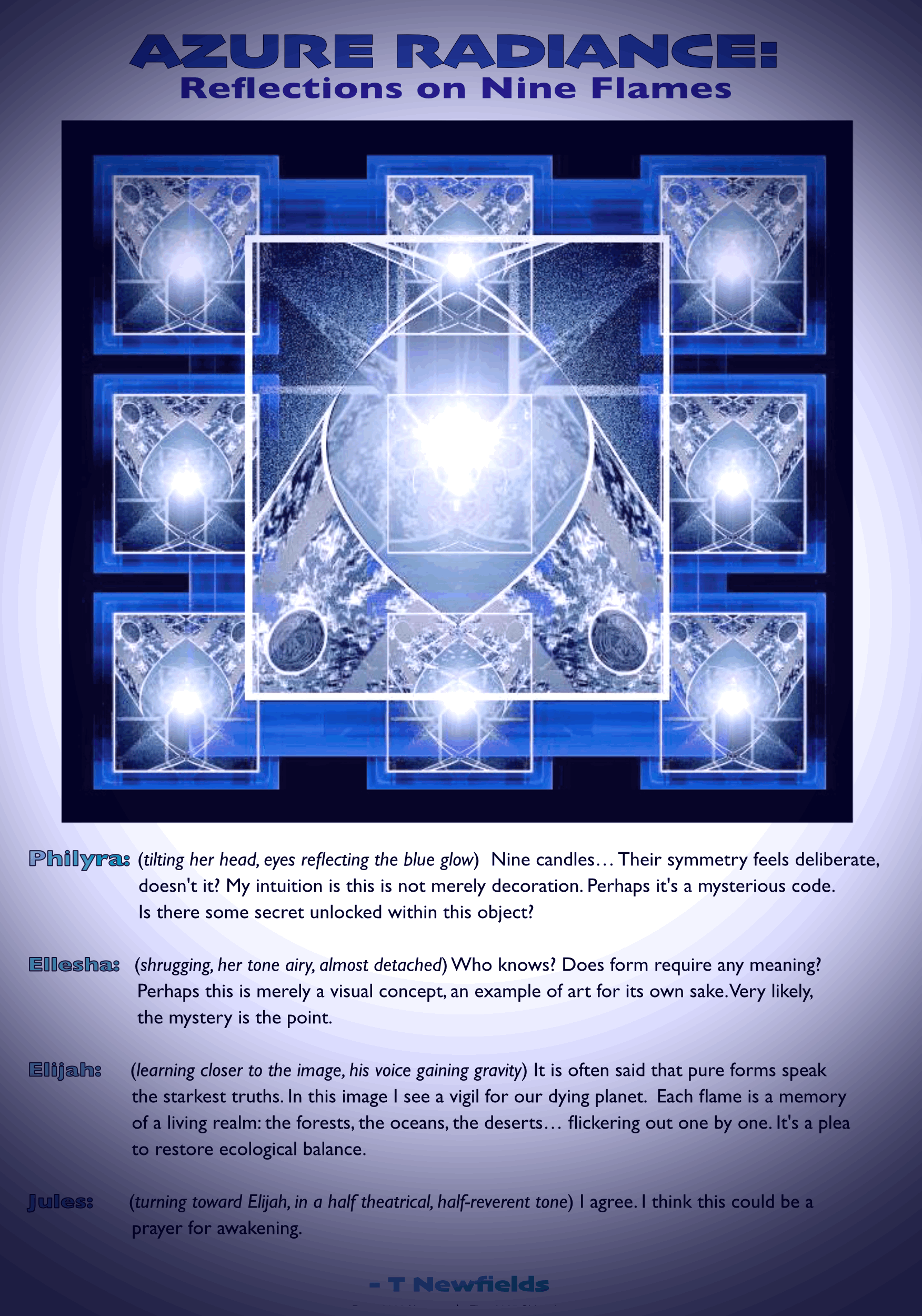 - (learning closer to the image, his voice gaining gravity) It is often said that pure forms speak the starkest truths. In this image I see a vigil for our dying planet. Each flame is a memory of a living realm: the forests, the oceans, the deserts… flickering out one by one. It's a plea to restore ecological balance.