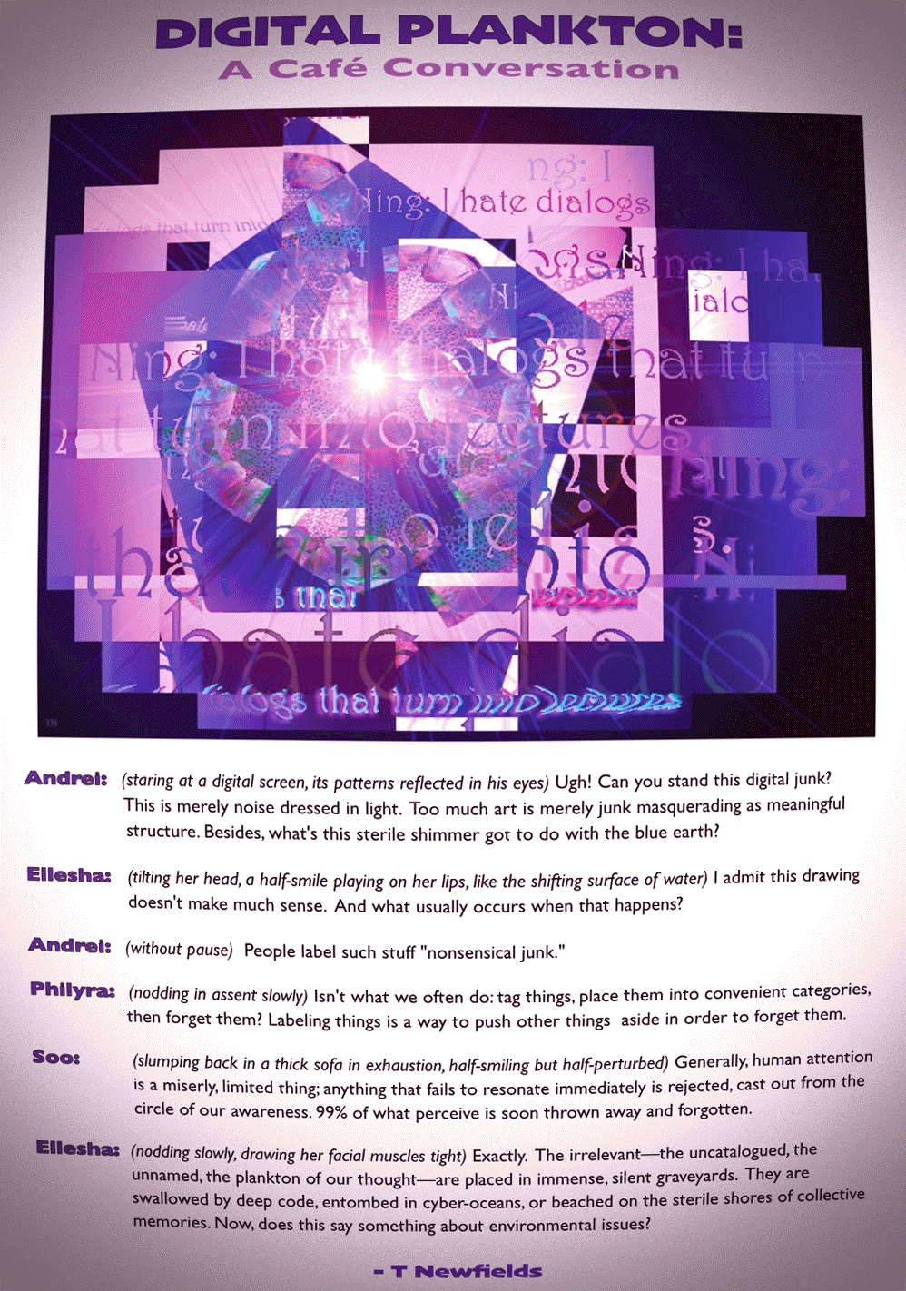 (staring at a digital screen, its patterns reflected in his eyes) Ugh! Can you stand this digital junk? This is merely noise dressed in light. Too much art is merely junk masquerading as meaningful structure. Besides, what's this sterile shimmer got to do with the blue earth?