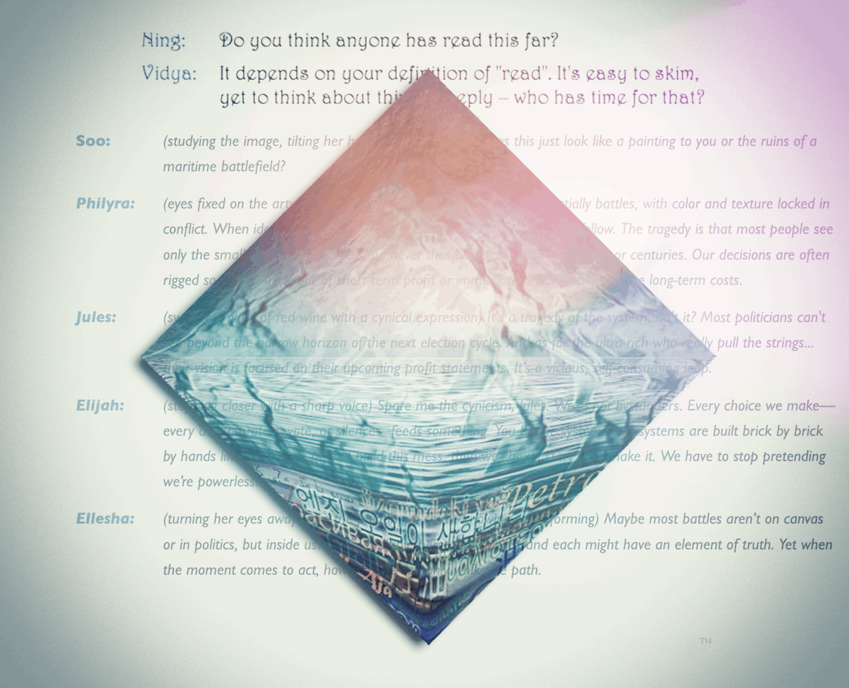(turning her eyes away from the painting, a small, knowing smile forming) Maybe most battles aren’t on canvas or in politics, but inside us. Often, multiple perspectives exist and each might have an element of truth. Yet when the moment comes to act, however, we can only walk one path.