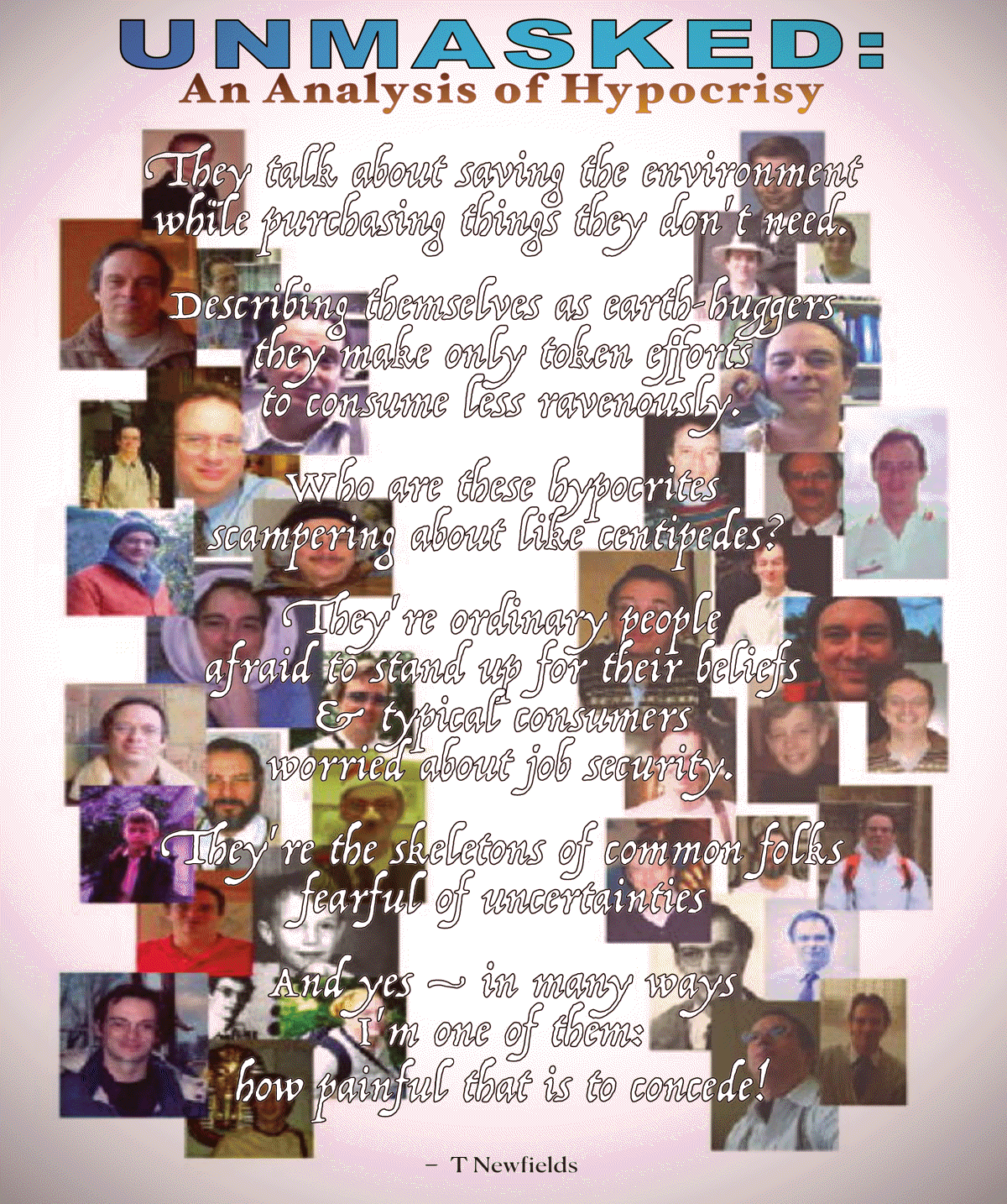 Unmasked:An Analysis of Hypocrisywhile purchasing things they don't need. Describing themselves as earth-huggers they make only token efforts to consume less ravenously. Who are these hypocrites scampering about like centipedes? They're ordinary people afraid to stand up for their beliefs & typical consumers worried about job security. They're the skeletons of common folks fearful of uncertainties And yes – in many ways I'm one of them: how painful that is to concede! |