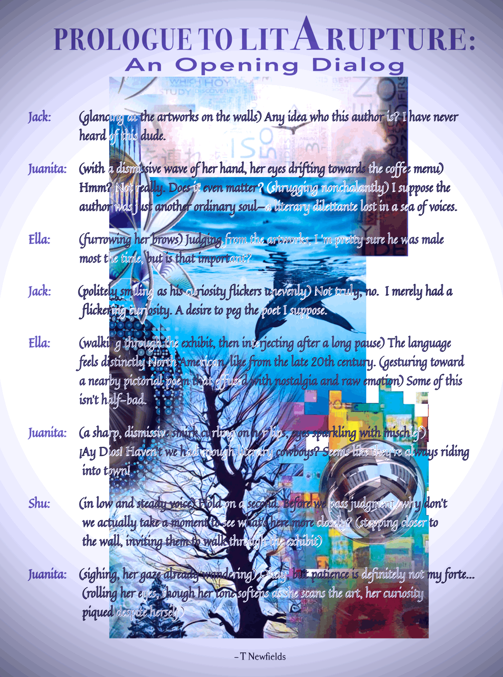 Jack:(glancing at the artworks on the walls) Any idea who this author is? I have never heard of this dude.Juanita:(with a dismissive wave of her hand, eyes drifting to the coffee menu) Hmm? Not really. Does it even matter? I suppose the author was just another ordinary soul—a literary dilettante lost in a sea of voices.Ella:(furrowing her brows) Judging from the artworks, I'm pretty sure he was male most of the time, but is that important?Jack:(politely smiling, curiosity flickering) Not truly, no. I merely had a flickering curiosity. A desire to peg the poet, I suppose.Ella:(walking through the exhibit, then speaking after a long pause) The language feels distinctly North American, late 20th century. (gesturing to a nearby pictorial poem) Some of this isn't half-bad.Juanita:(a sharp, dismissive smirk) ¡Ay Dios! Haven’t we had enough literary cowboys? Seems like they’re always riding into town!Shu:(in a low steady voice) Hold on. Before we pass judgment, let’s actually take a moment to see what's here more closely. (stepping closer, inviting them in)Juanita:(sighing) Okay, but patience isn't my forte… (rolling her eyes but scanning the art anyway)