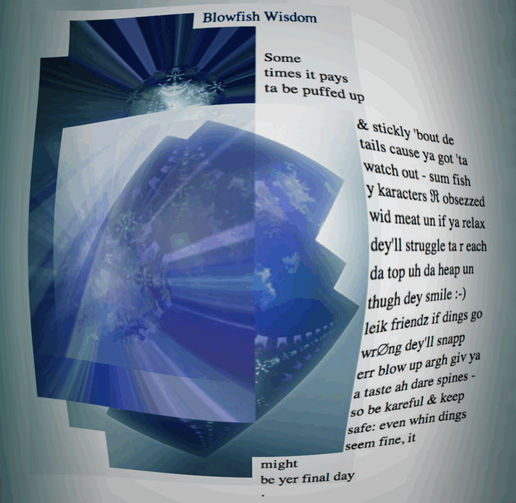 (approaching Soo cautiously with a intensely analytical gaze) Yeah, it is disconcerting to realize how bestial we are… Yet in a sense aren't we like small fish in a big ocean? (gesturing toward the pictorial poem nearest them with a tinge of vexation)