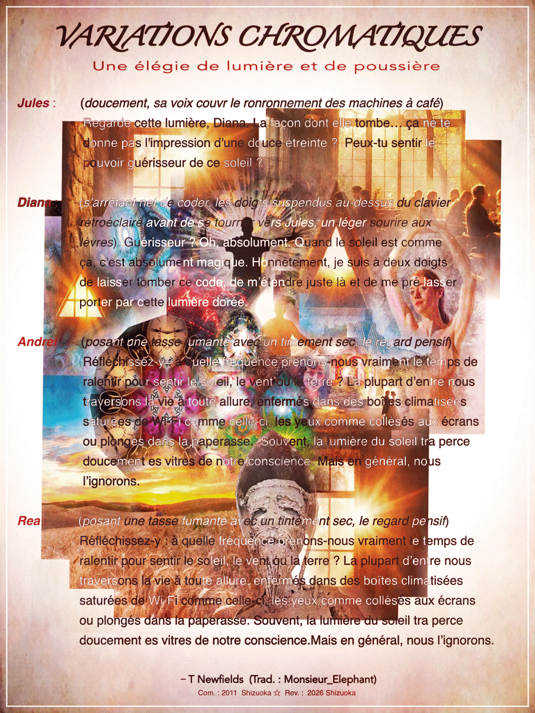 Andrei : (posant une tasse fumante avec un tintement sec, le regard pensif) Réfléchissez-y : à quelle fréquence prenons-nous vraiment le temps de ralentir pour sentir le soleil, le vent ou la terre ? La plupart d’entre nous traversons la vie à toute allure, enfermés dans des boîtes climatisées saturées de Wi-Fi comme celle-ci, les yeux comme collésés aux écrans ou plongés dans la paperasse. Souvent, la lumière du soleil tra perce doucement es vitres de notre conscience. Mais en général, nous l’ignorons.