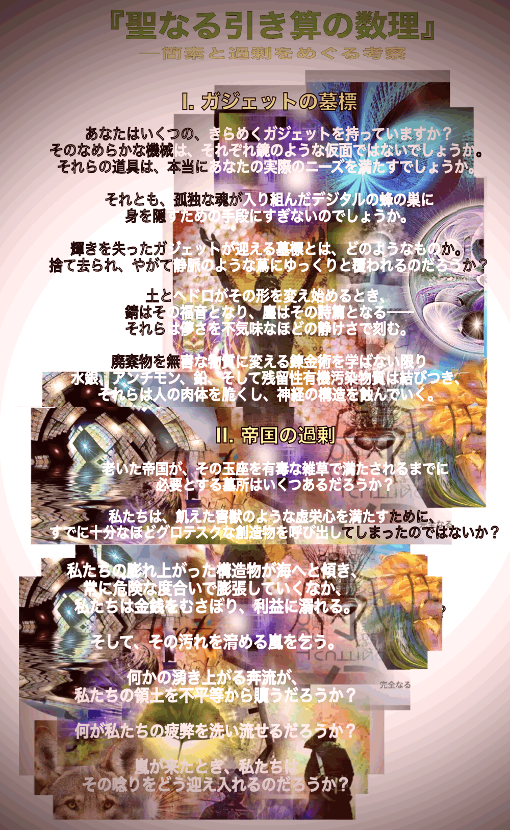 (確固たる確信をもって頷き、声は深く、大地のような響きを帯びる)ご存知の通り、それは多くの人々には通用しない。落ち着きのない心を持つ我々のような人間は、完璧な幾何学を持つ厳格で磨き上げられた教義に反抗しがちだ。遅かれ早かれ、私たちは「完璧な」平和を約束するあらゆる壁を蹴破ることになる。完璧な簡素さ——疑いも内なる矛盾もない人生——は、大人の大多数にとっては不可能に見える。それを達成できるのは、結果から守られた乳児、機微を理解できない愚者、あるいは、進んで疑う力を焼き捨てた狂信者だけだ。残る私たちは、ごちゃごちゃした、混沌とした中間地点に生きる運命なのだ。 |