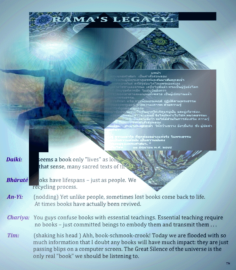 | Chariya: | You guys confuse books with essential teachings. Essential teaching require no books – just committed beings to embody them and transmit them . . . |