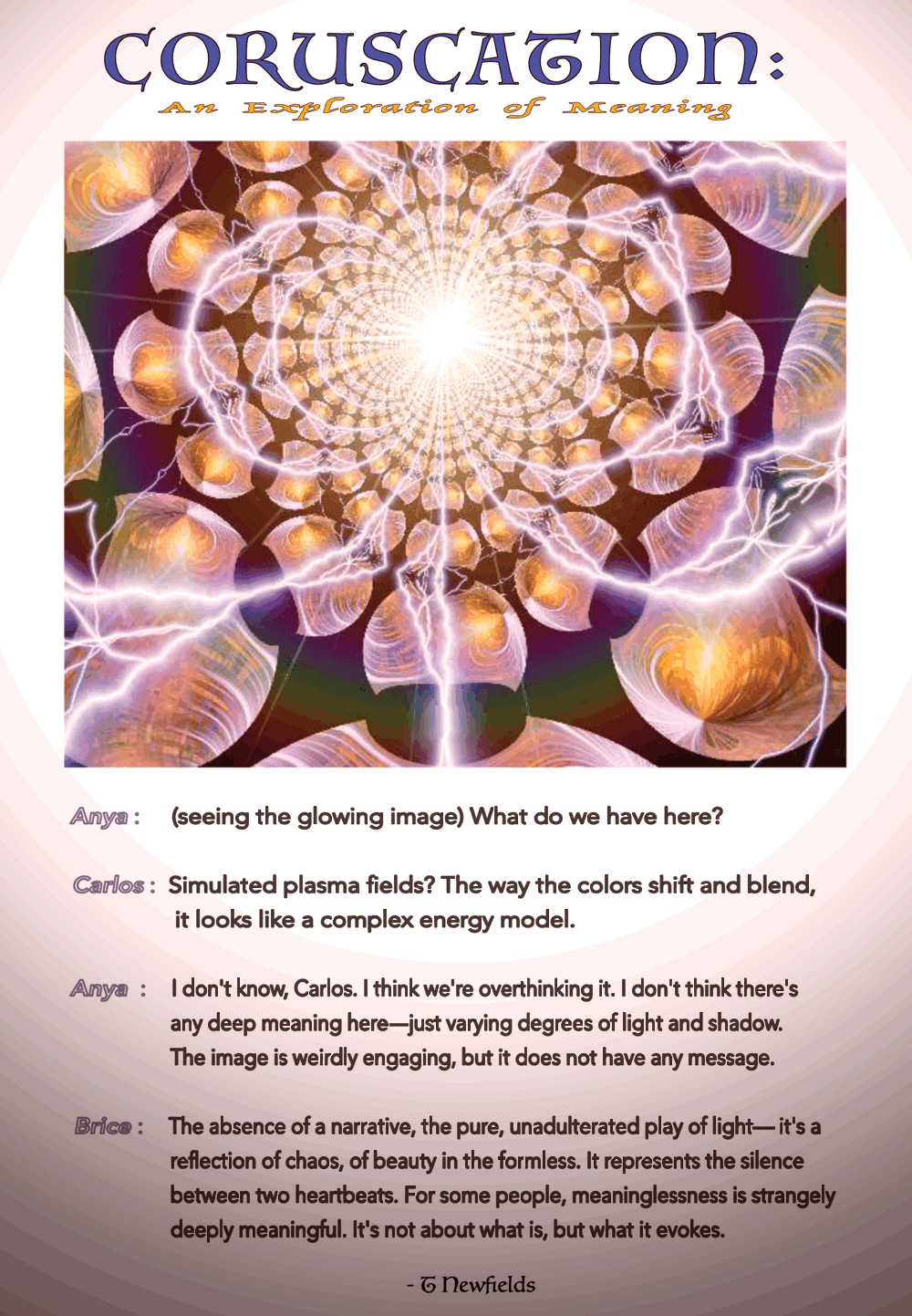 The absence of a narrative, the pure, unadulterated play of light—it's a reflection of chaos, of beauty in the formless. It represents the silence between two heartbeats. For some people, meaninglessness is strangely deeply meaningful. It's not about what is, but what it evokes. |