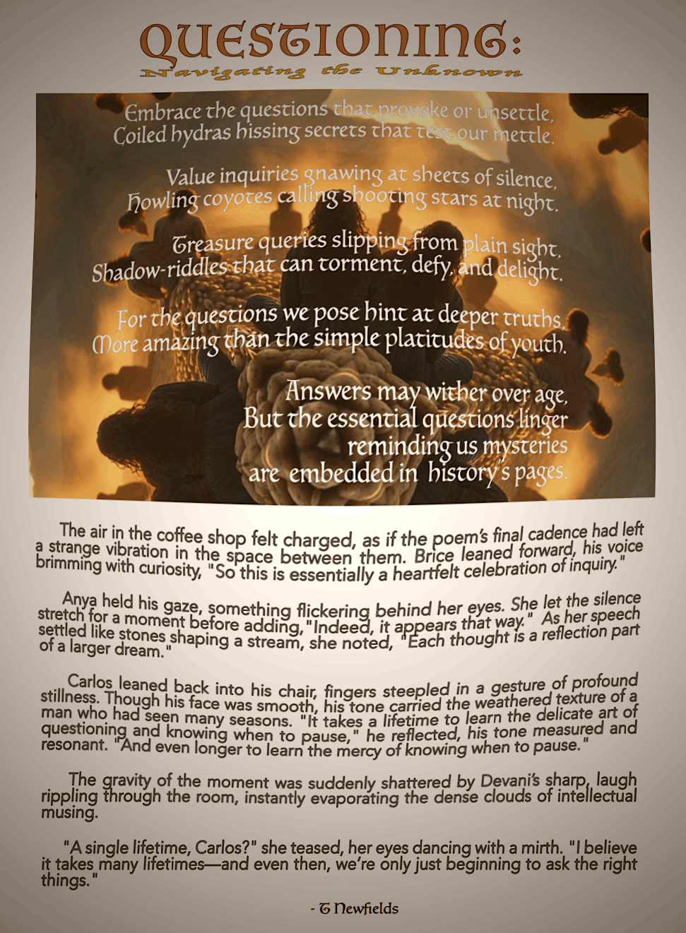 The air in the coffee shop felt charged, as if the poem’s final cadence had left a strange vibration in the space between them. Brice leaned forward, his voice brimming with curiosity, "So this is essentially a heartfelt celebration of inquiry."