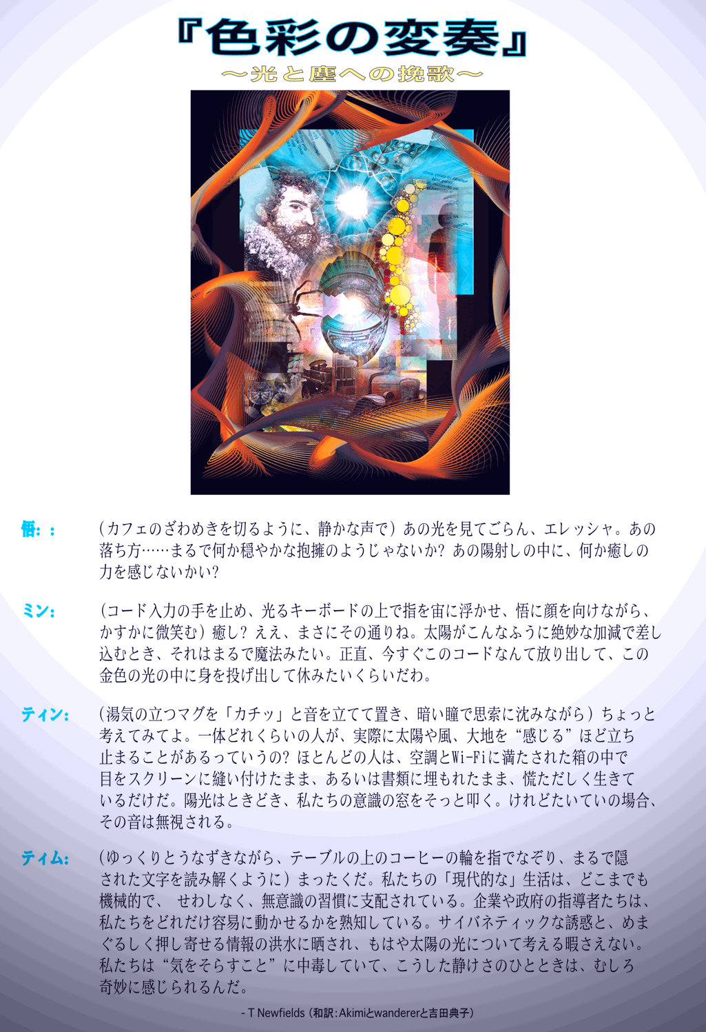 | 悟: | (カフェのざわめきを切るように、静かな声で) あの光を見てごらん、エレッシャ。あの落ち方……まるで何か穏やかな抱擁のようじゃないか?あの陽射しの中に、何か癒しの力を感じないかい? |